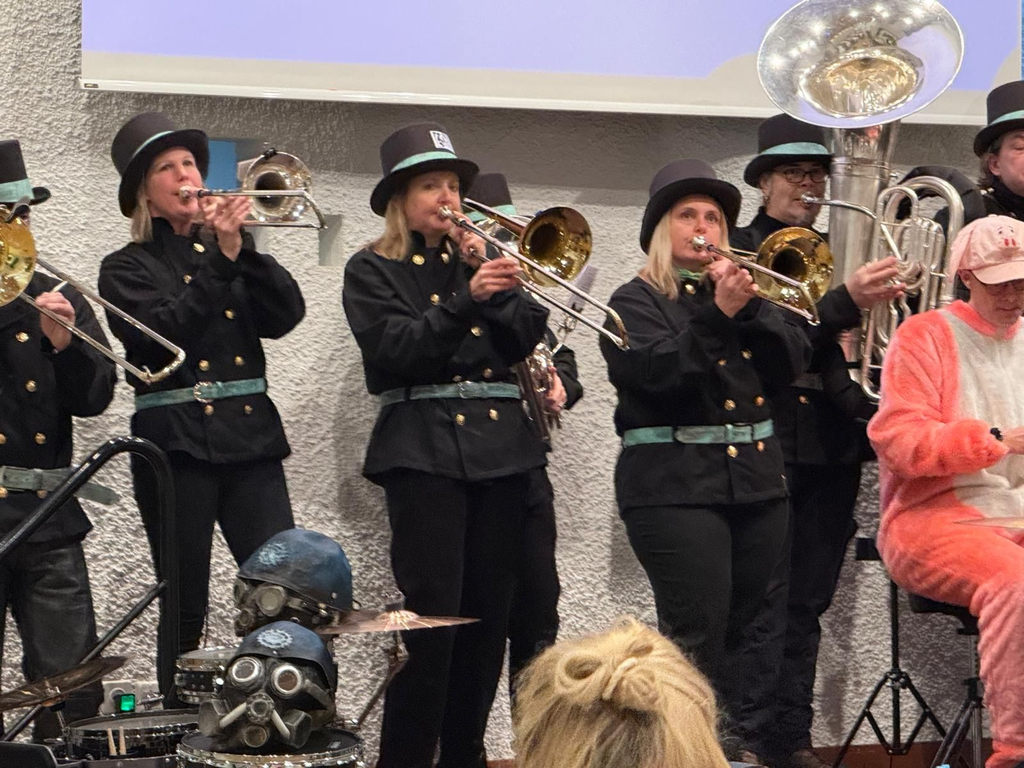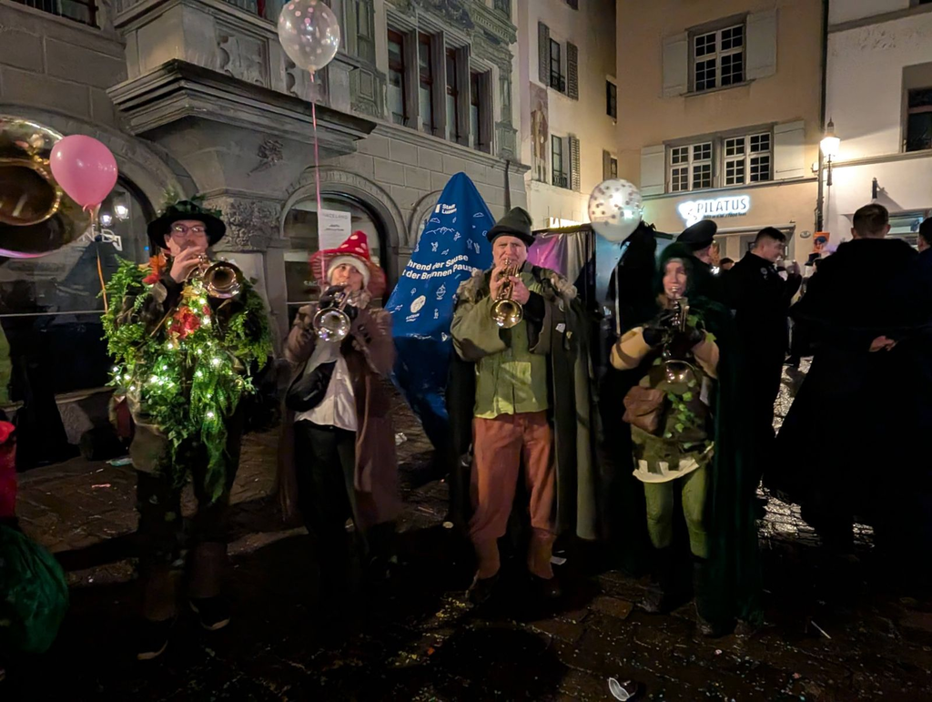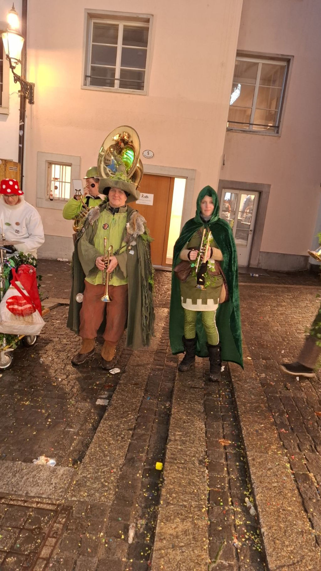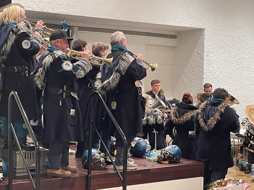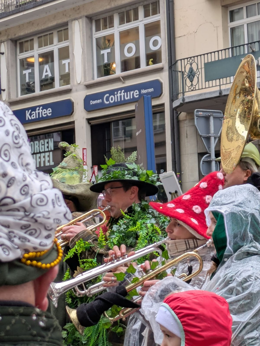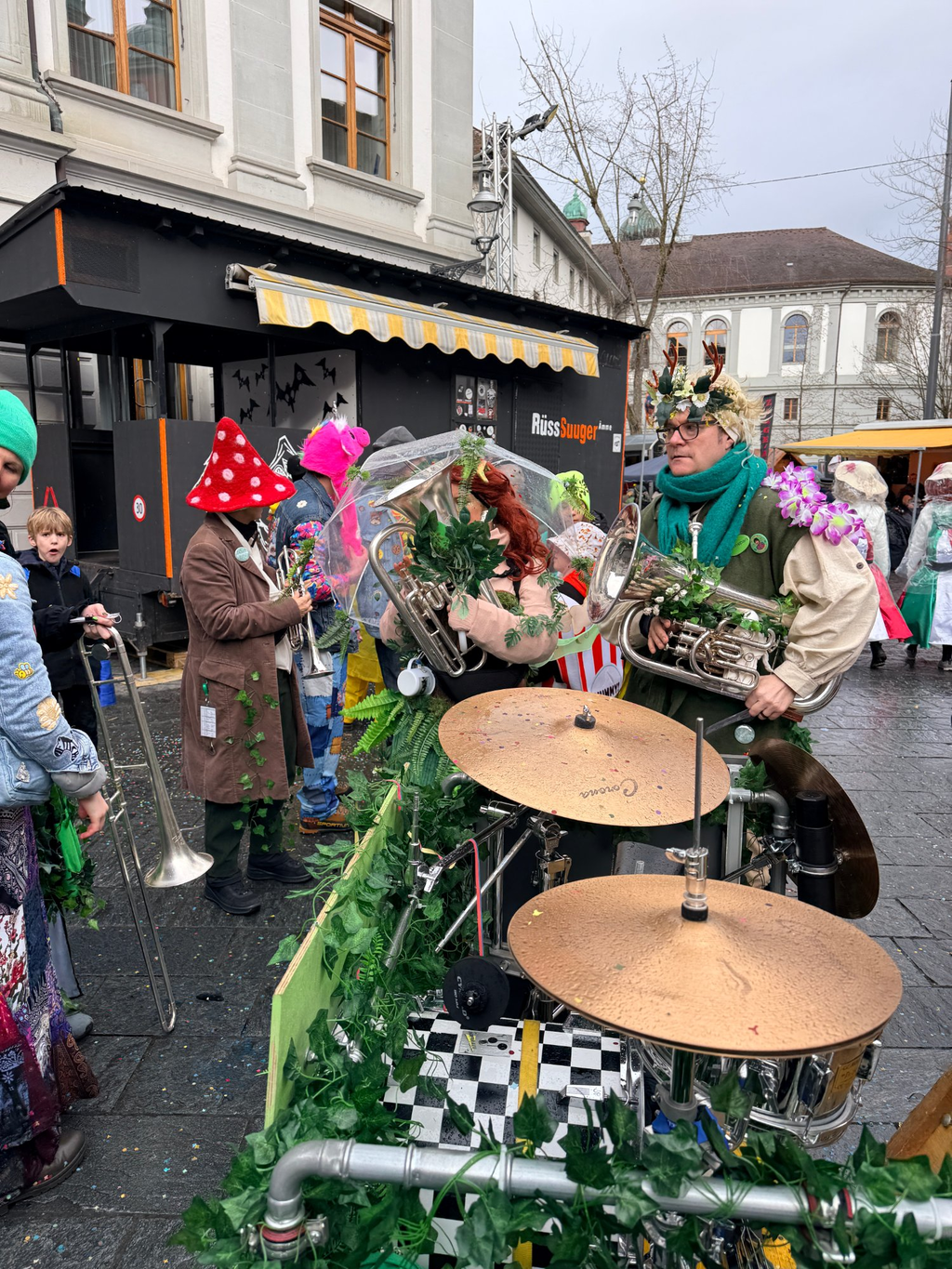 Für die Fasnacht 2024 spielen wir in einer Besetzung mit vier Trompeten, drei Posaunen, zwei Hörnlis, zwei Tubas, einem Schlagzeug und einem ökologisch geprüften Kaffeewagen (mit Extrazucker).
