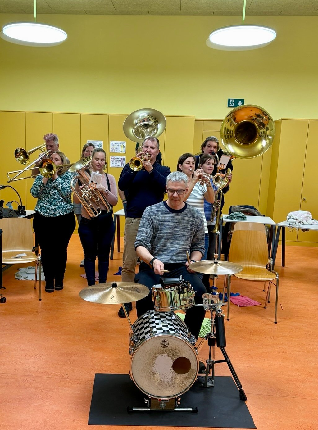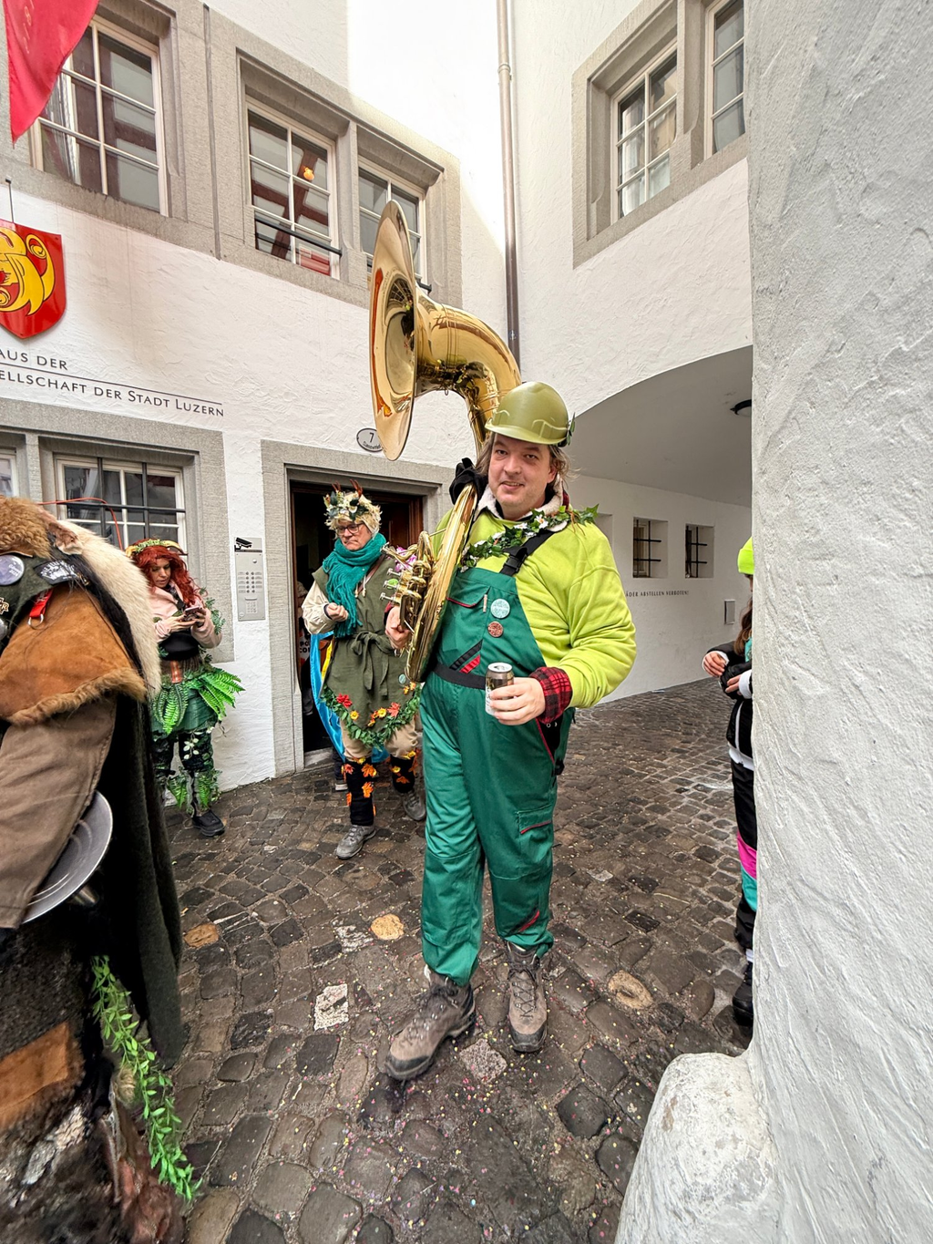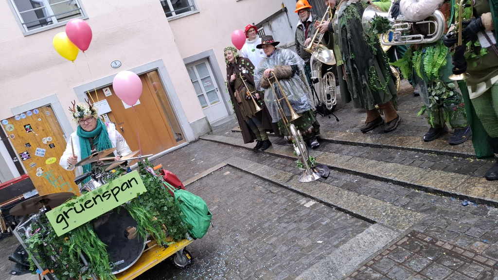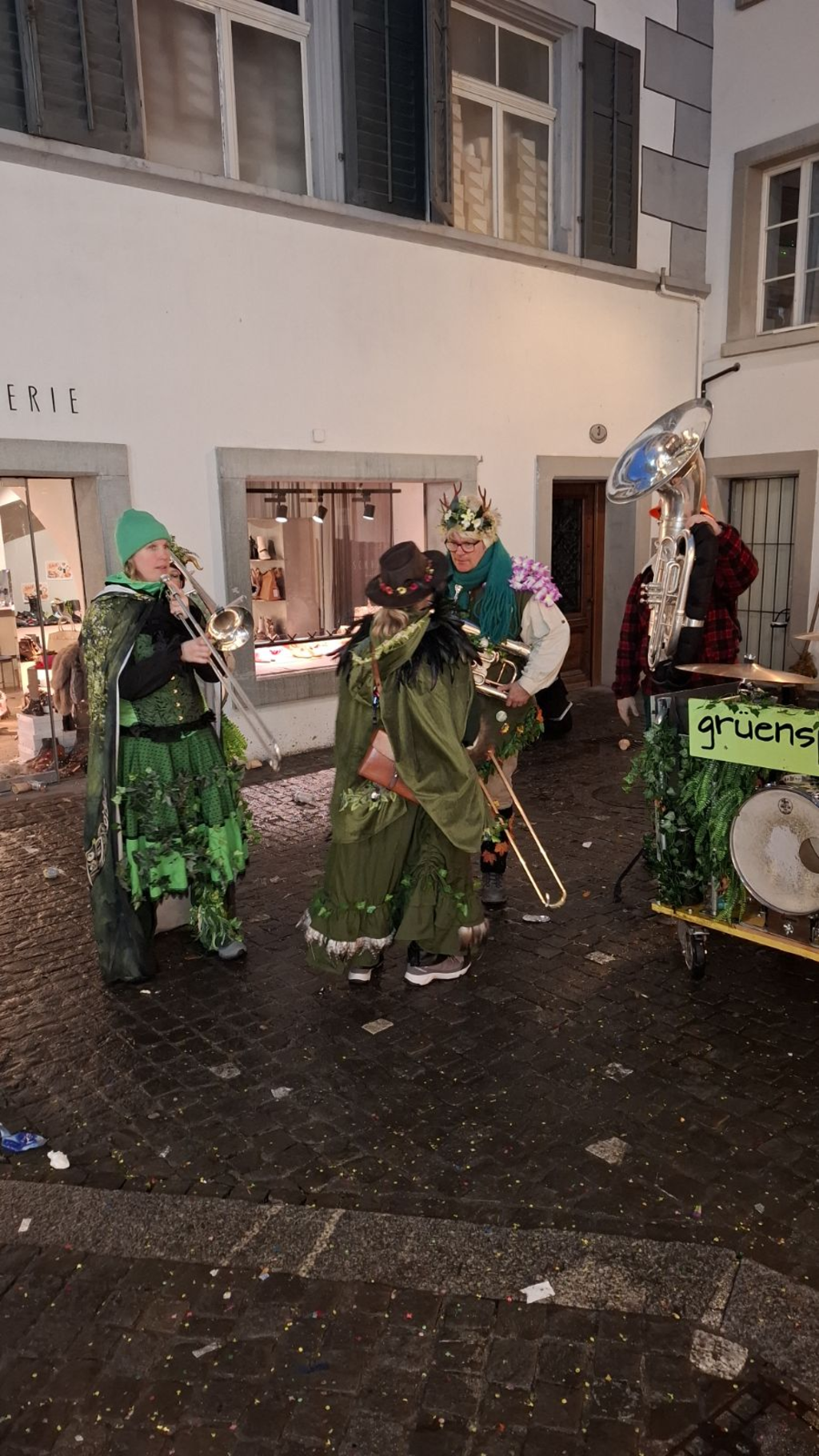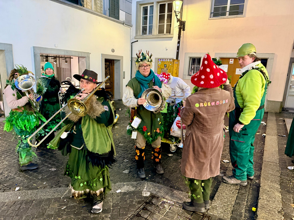 Für die Fasnacht 2024 spielen wir in einer Besetzung mit vier Trompeten, drei Posaunen, zwei Hörnlis, zwei Tubas, einem Schlagzeug und einem ökologisch geprüften Kaffeewagen (mit Extrazucker).