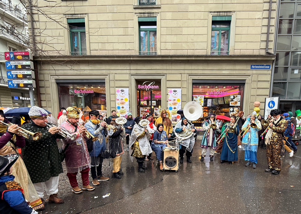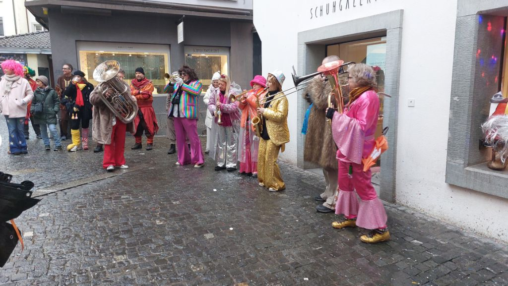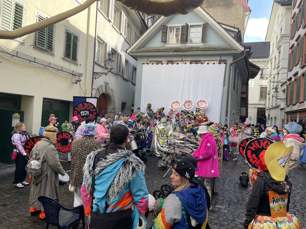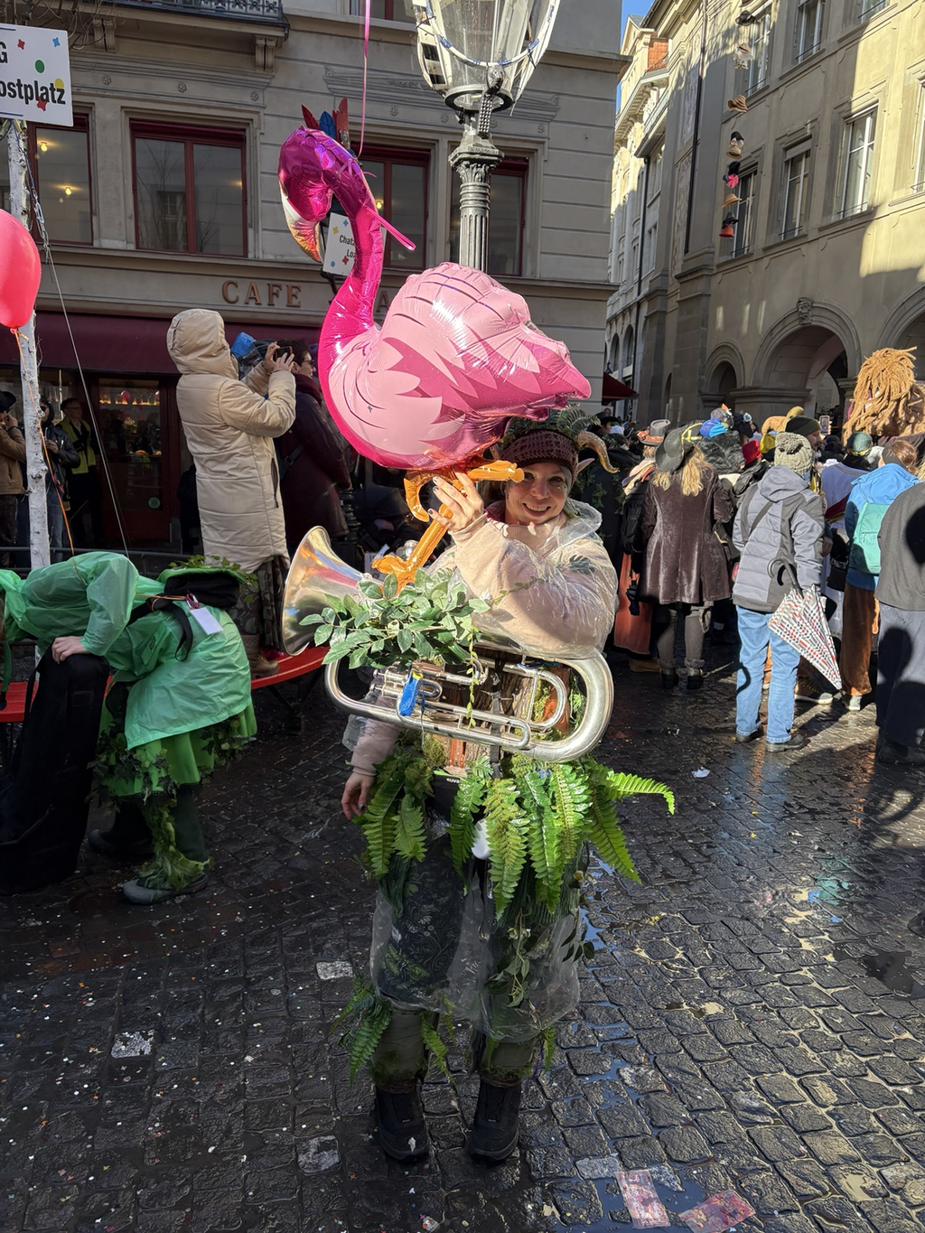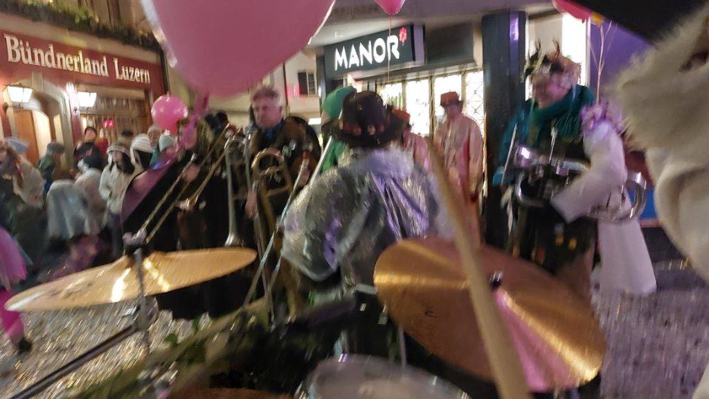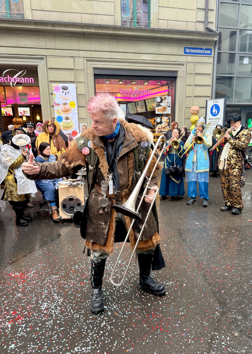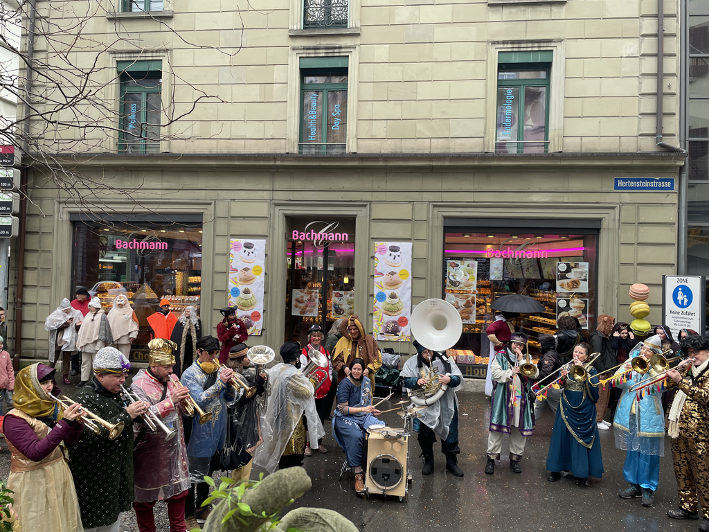 Für die Fasnacht 2024 spielen wir in einer Besetzung mit vier Trompeten, drei Posaunen, zwei Hörnlis, zwei Tubas, einem Schlagzeug und einem ökologisch geprüften Kaffeewagen (mit Extrazucker).
