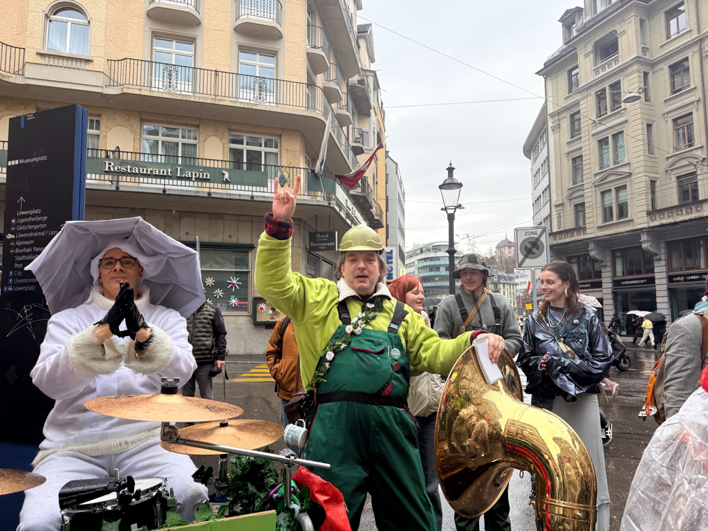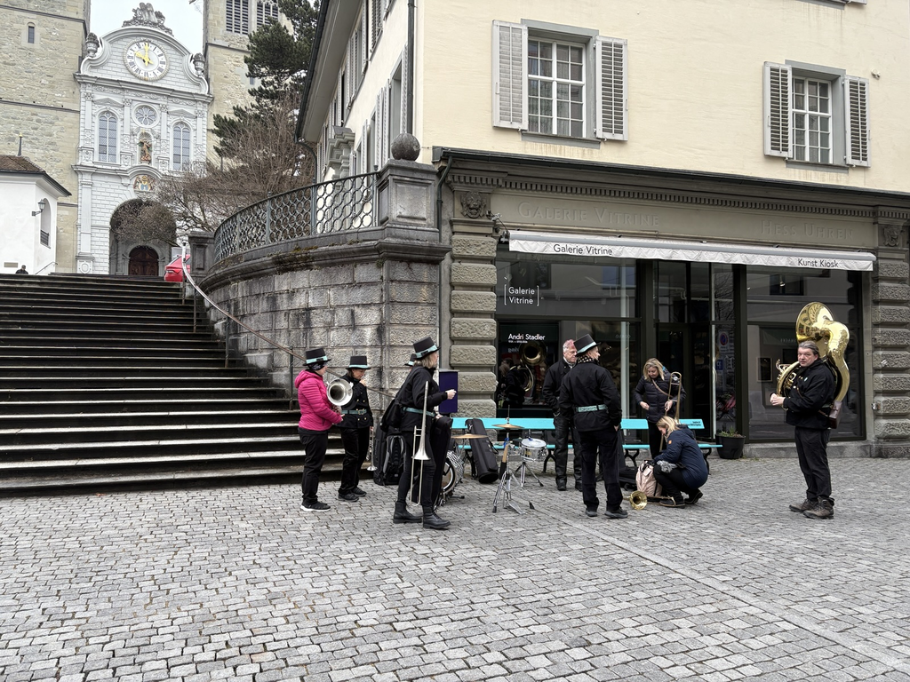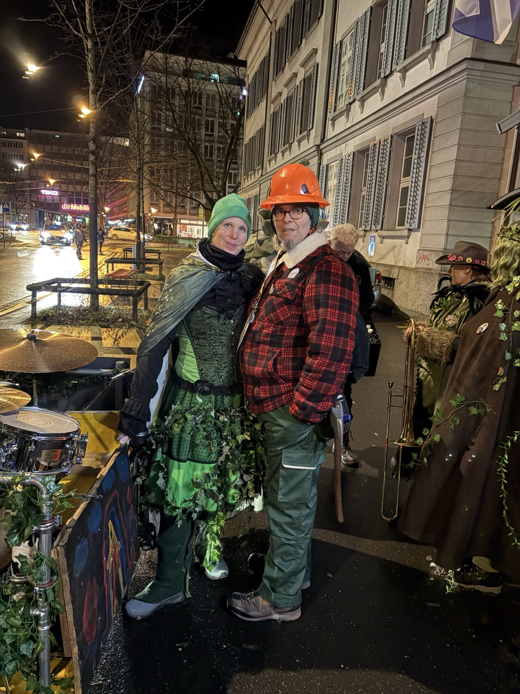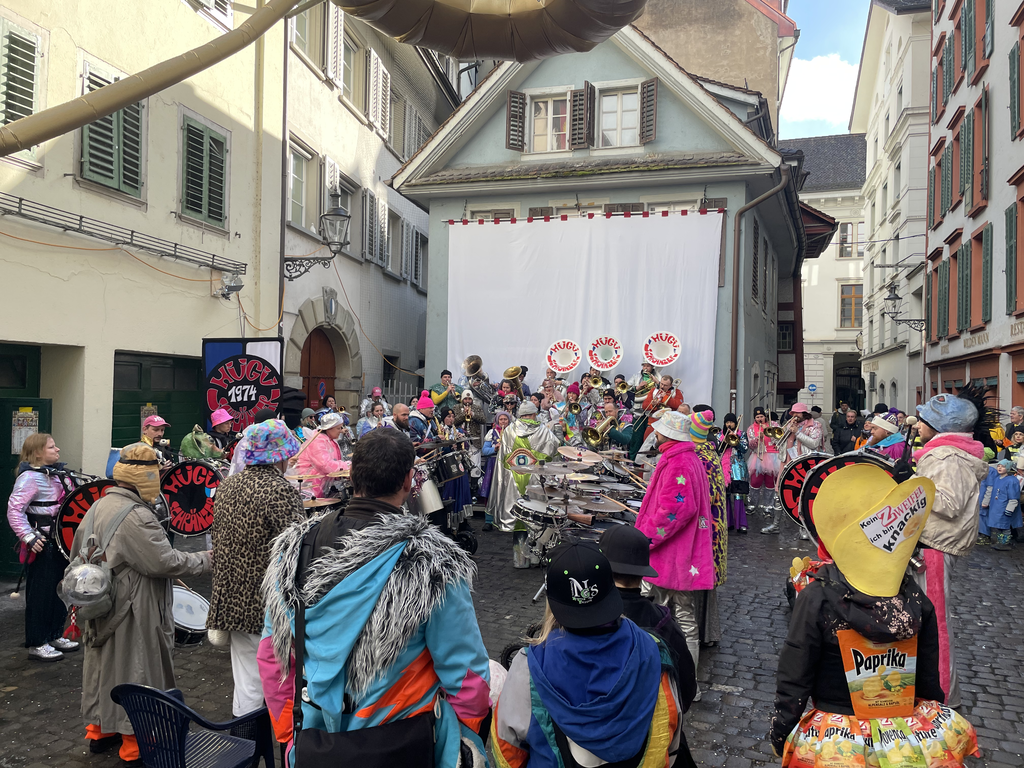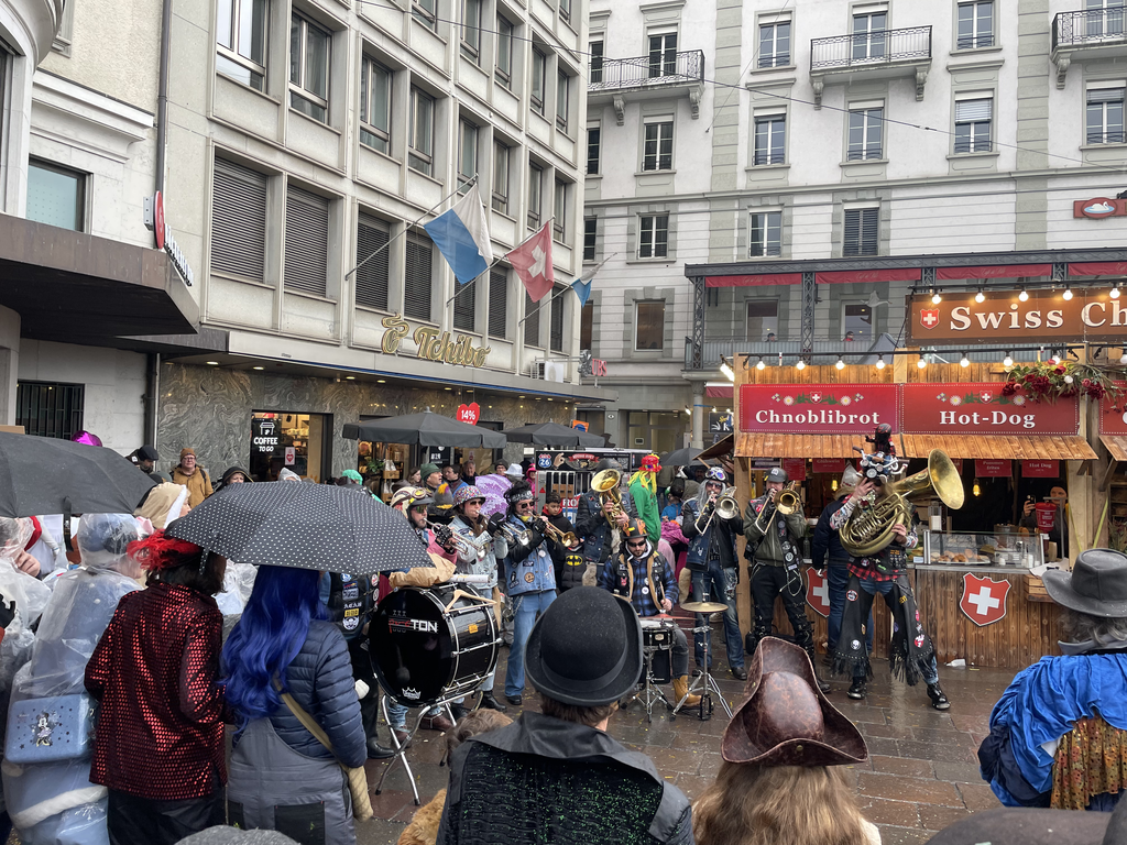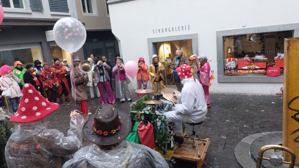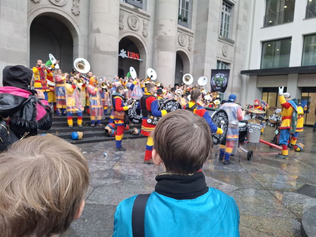 Für die Fasnacht 2024 spielen wir in einer Besetzung mit vier Trompeten, drei Posaunen, zwei Hörnlis, zwei Tubas, einem Schlagzeug und einem ökologisch geprüften Kaffeewagen (mit Extrazucker).