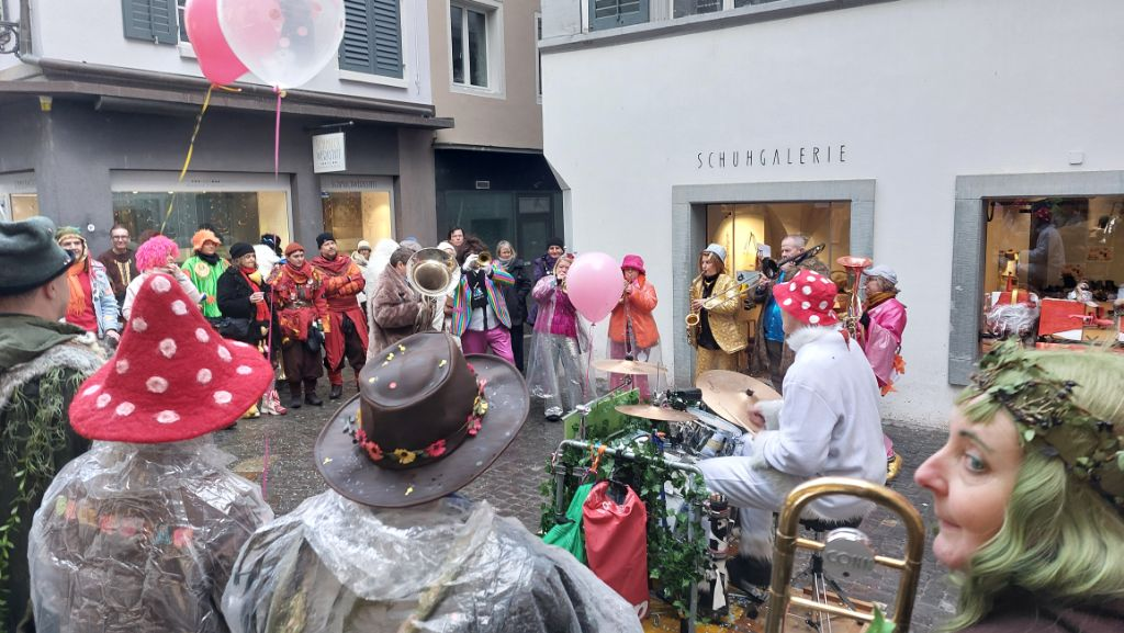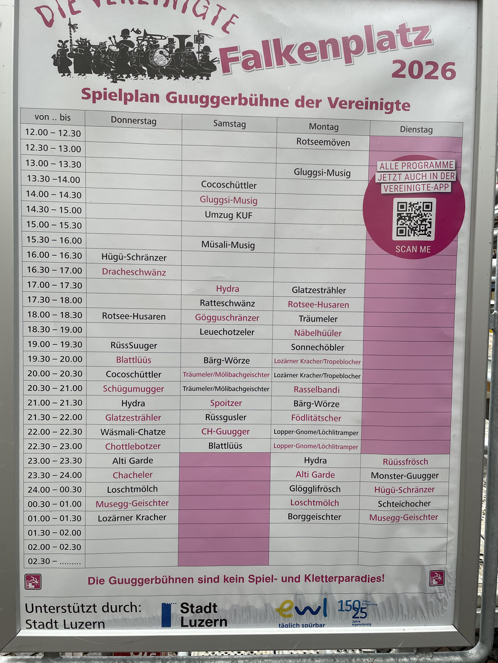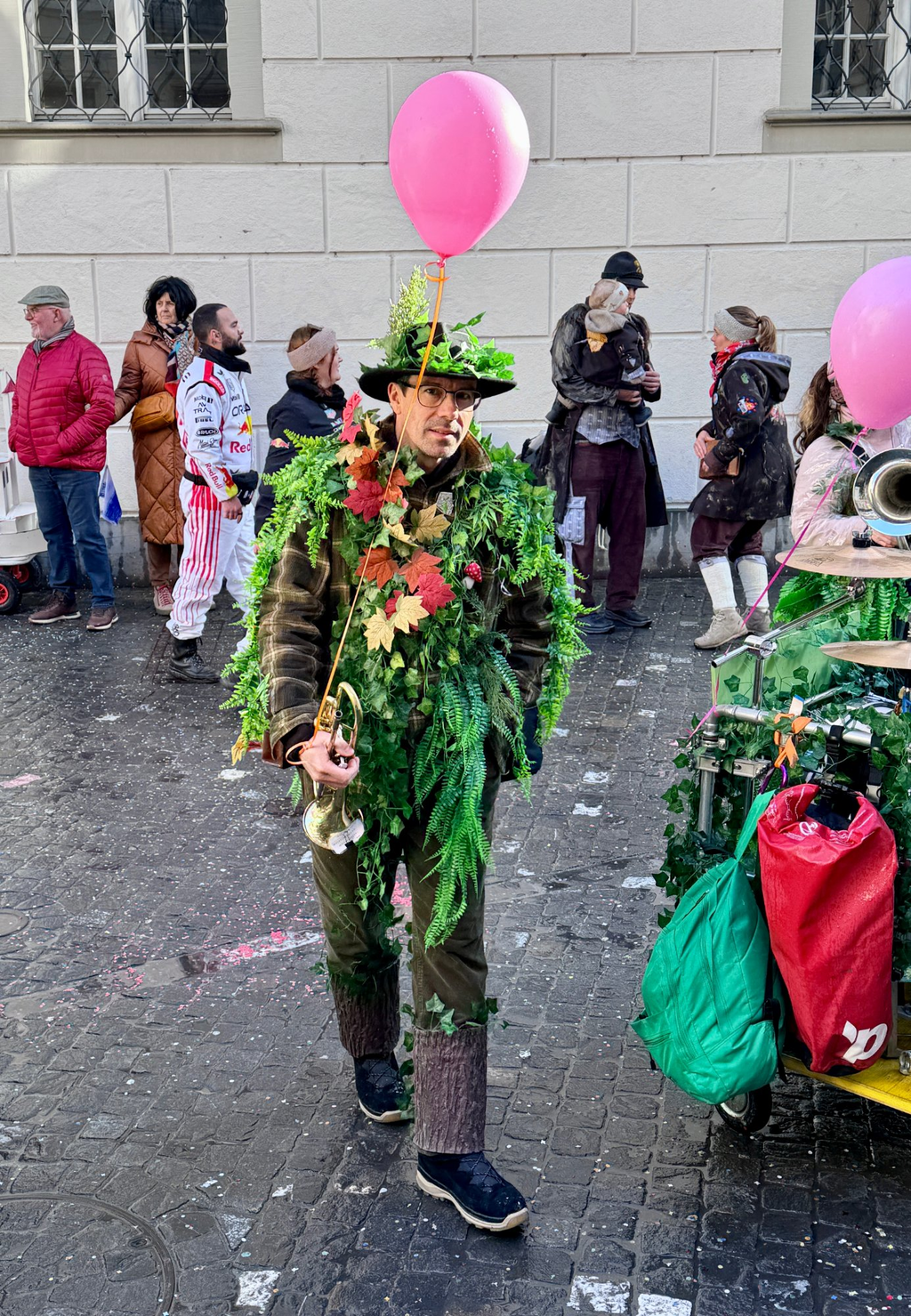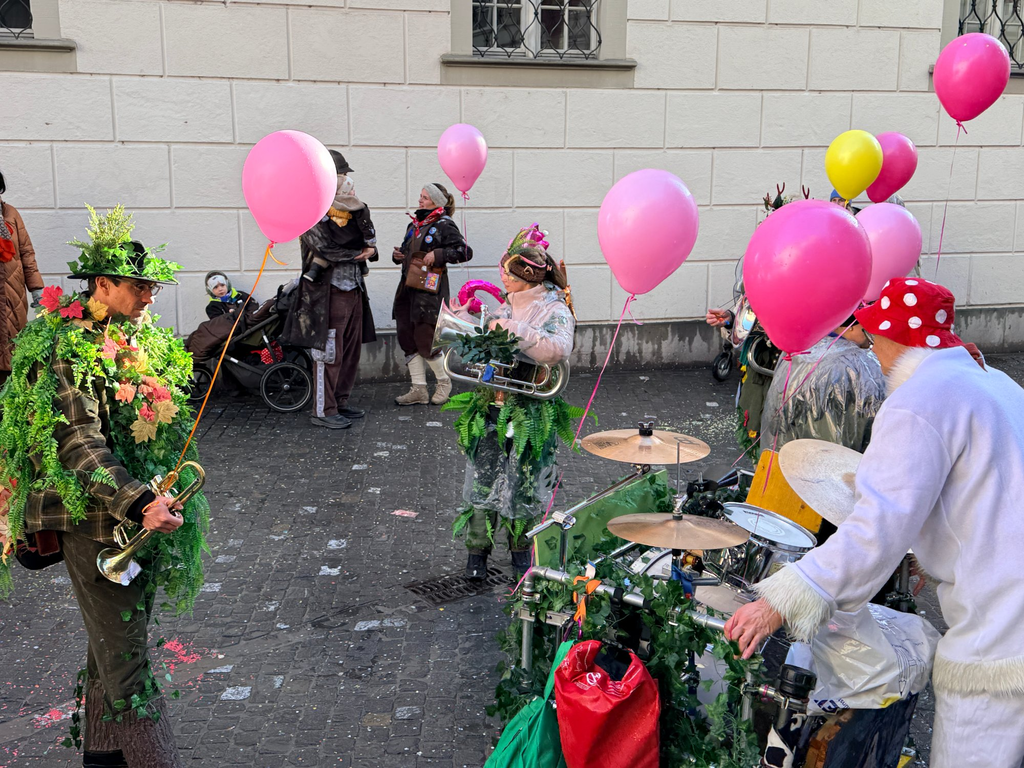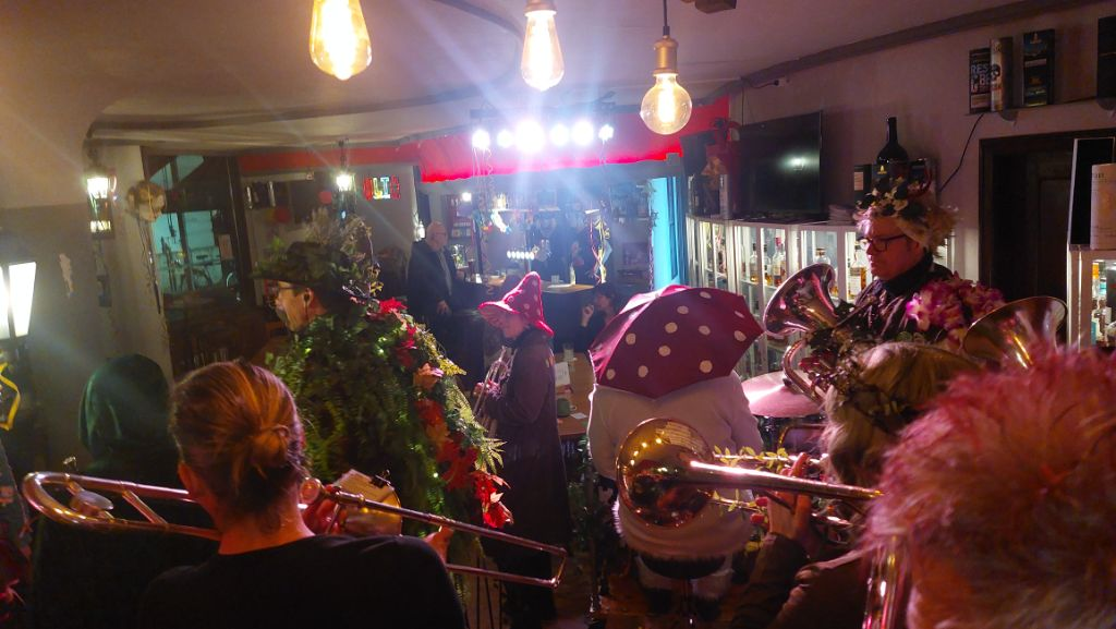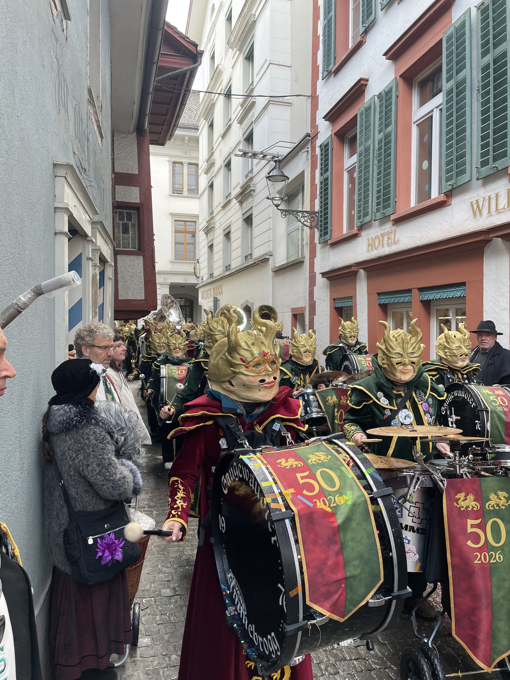 Für die Fasnacht 2024 spielen wir in einer Besetzung mit vier Trompeten, drei Posaunen, zwei Hörnlis, zwei Tubas, einem Schlagzeug und einem ökologisch geprüften Kaffeewagen (mit Extrazucker).