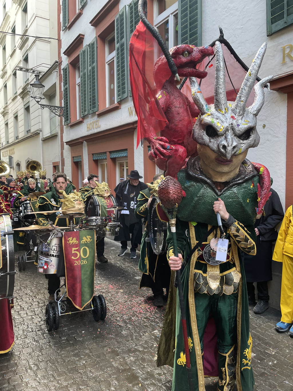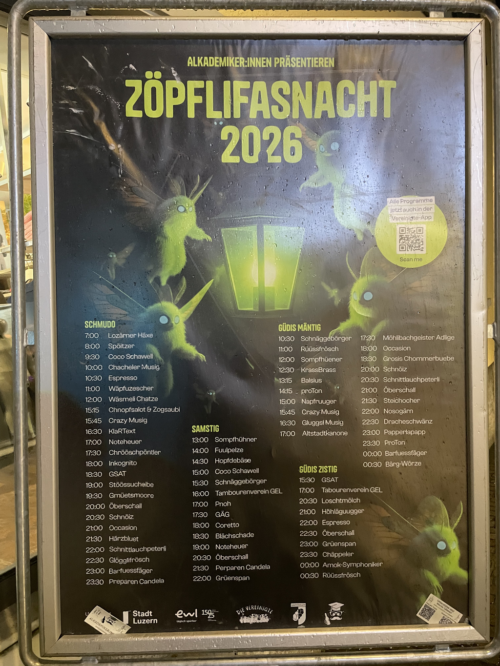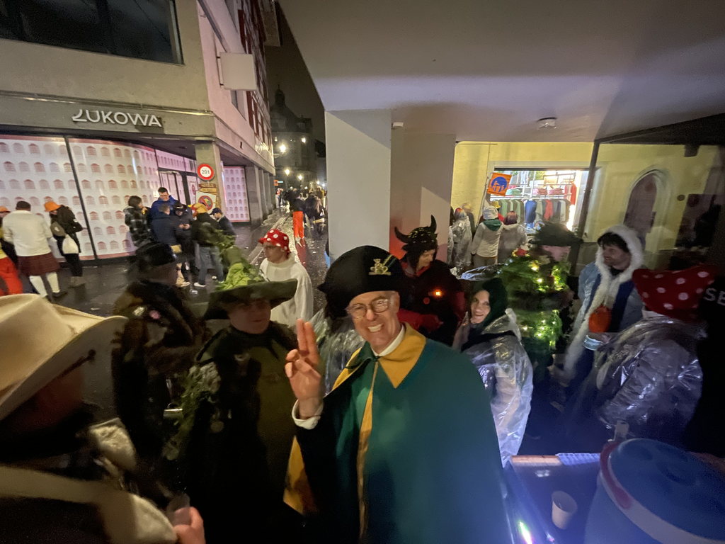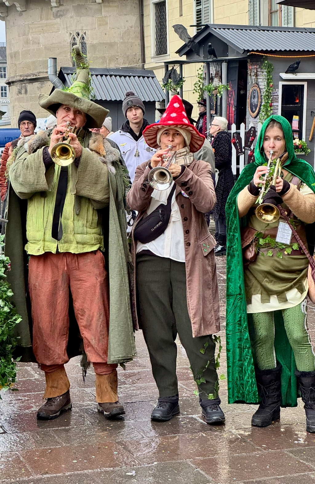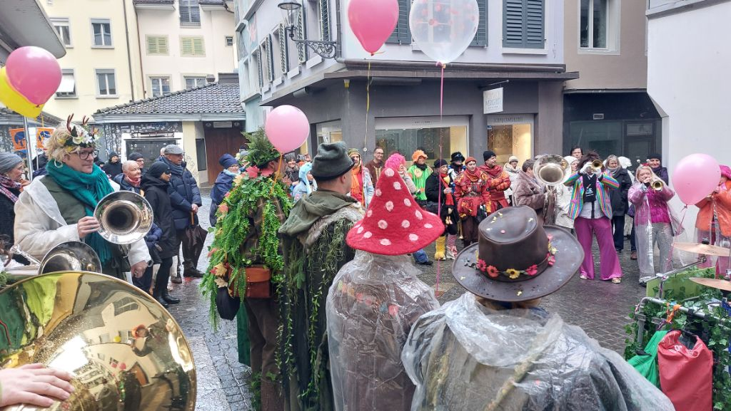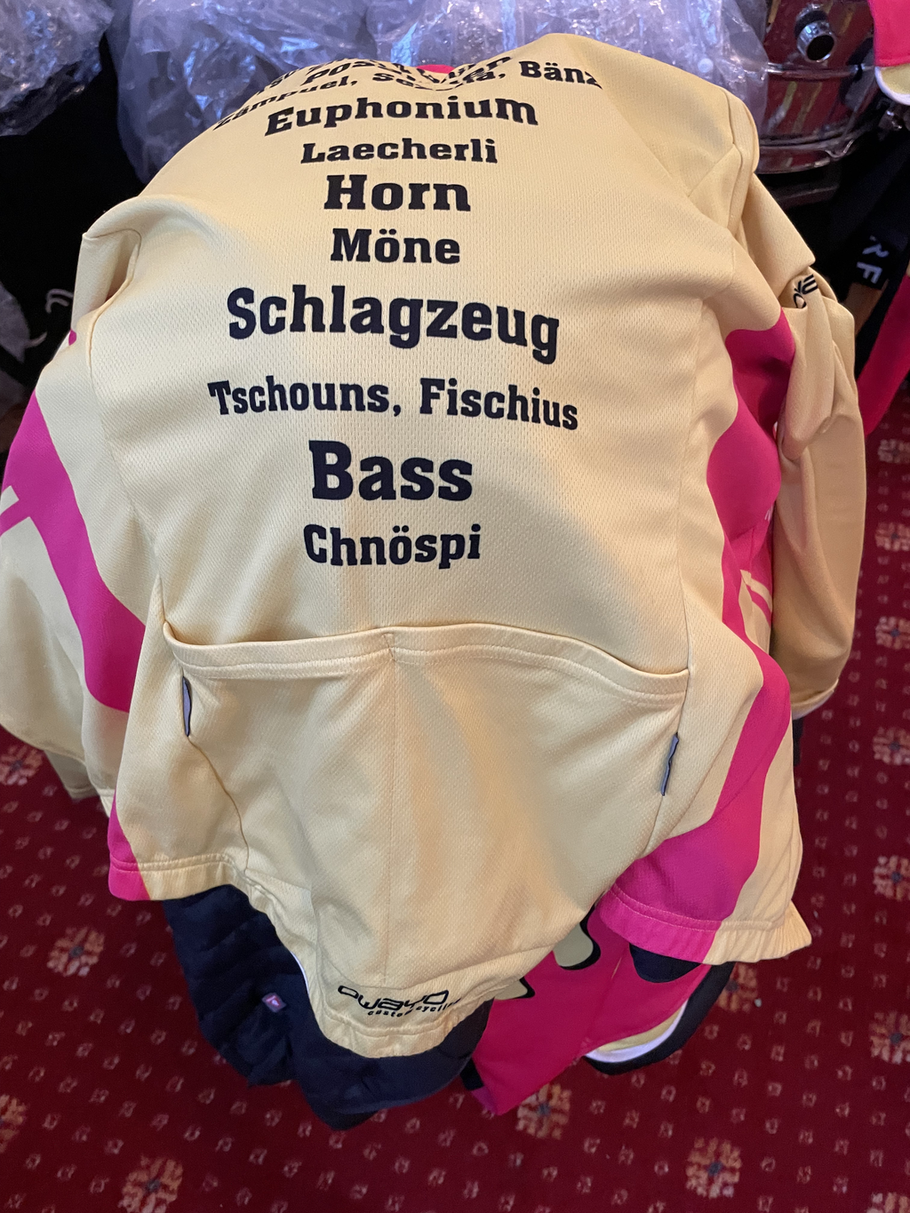 Für die Fasnacht 2024 spielen wir in einer Besetzung mit vier Trompeten, drei Posaunen, zwei Hörnlis, zwei Tubas, einem Schlagzeug und einem ökologisch geprüften Kaffeewagen (mit Extrazucker).
