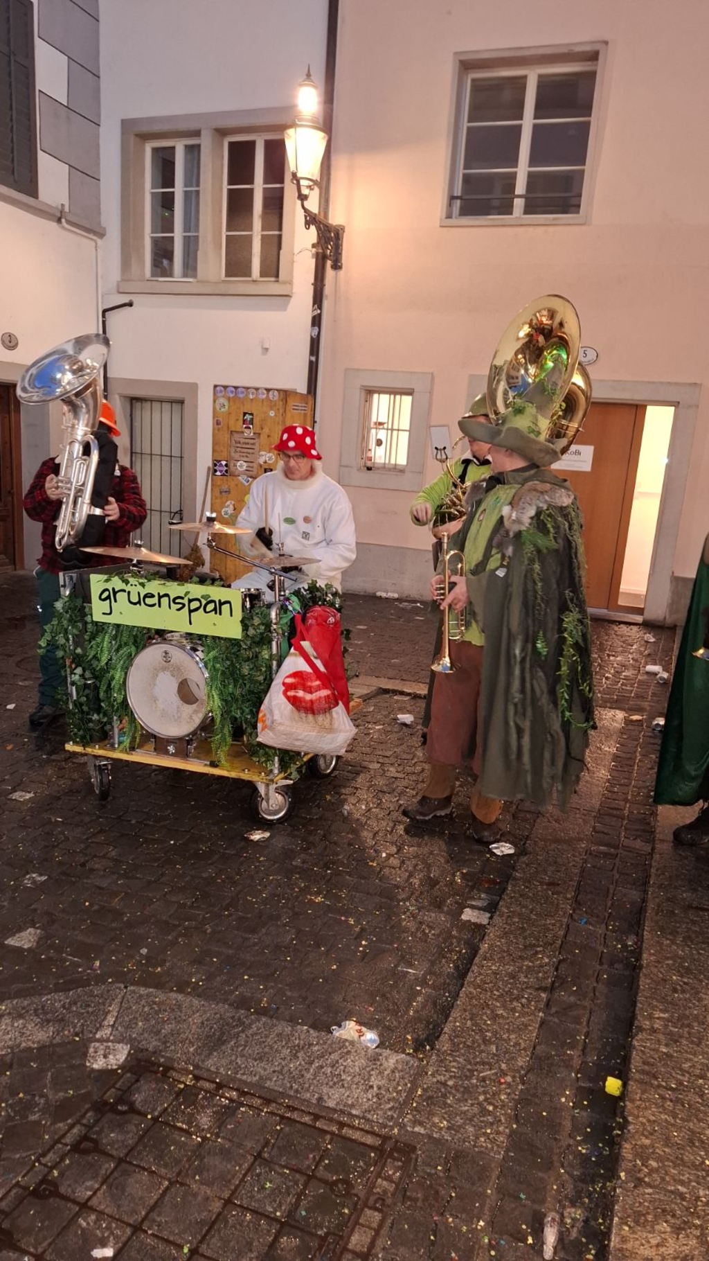 Unseren Namen fanden wir einmal an einer Probe in einem Guuggi, besser gesagt in einer Posaune. Alle fühlten sich sehr angesprochen und ab sofort hiessen wir Grüenspan.
